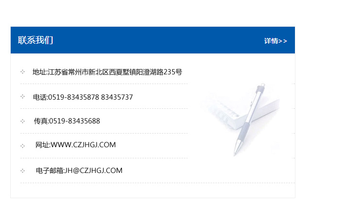 地址:常州市新北區友邦商務大廈1幢16、17層  電話:0519-85101652  傳真:0519-85112595  郵編:213022  網址:www.cz-jiayue_cn.sanguozhai.com  郵箱:xiajifengaa@163.com